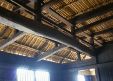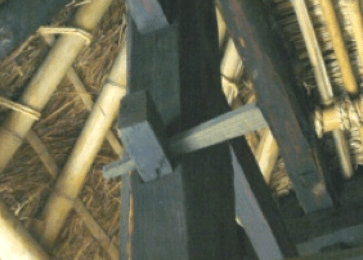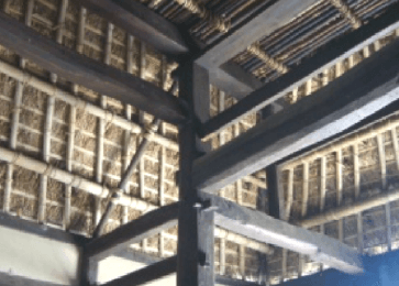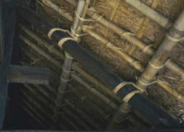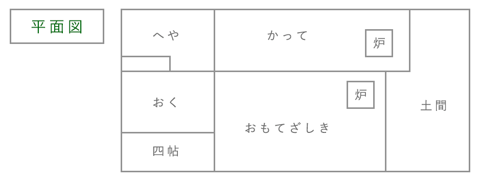 建物は茅葺きの入母屋造りの平入りで、その大きさは桁行七間半、梁間五間で長方形の平面をなしています。間取りは、土間と5つの部屋で構成されています。大黒柱(棟持柱)がなく、細い柱で梁を支えているのが特徴で、桁と柱には杉、梁にはケヤキ・松が用いられています。手斧(ちょうな)や槍鉋(やりがんな)が使用され、全面的に丸みを帯びた仕上げになっています。
